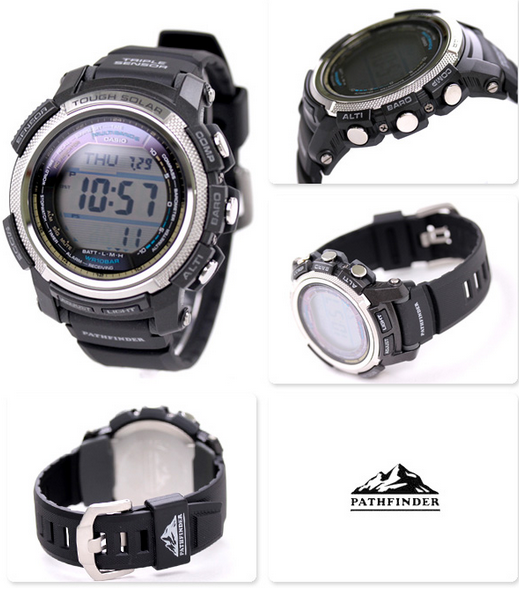 这款型号PAW2000-1CR,属于PATHFINDER探路者系列,是PAW1300的升级版本,采用50mm树脂表盘,11.5mm超薄设计。日本原装石英机芯,防水100m。可接收全球6局电波,包括国内商丘站信号,太阳能驱动系统、双重液晶显示,光动能技术。坚韧的耐低温规格可抵抗摄氏-10°C的恶劣气候。还拥有卡西欧当家三重感应器:数字罗盘(方向感应器)、温度计(温度感应器)、高度计(压力感应器)。包括31时区(48城市)、城市代码显示、日光节约时间、城市代码显示、日出/日落时间显示、5组独立闹铃、全自动日历、夜间显示等功能。