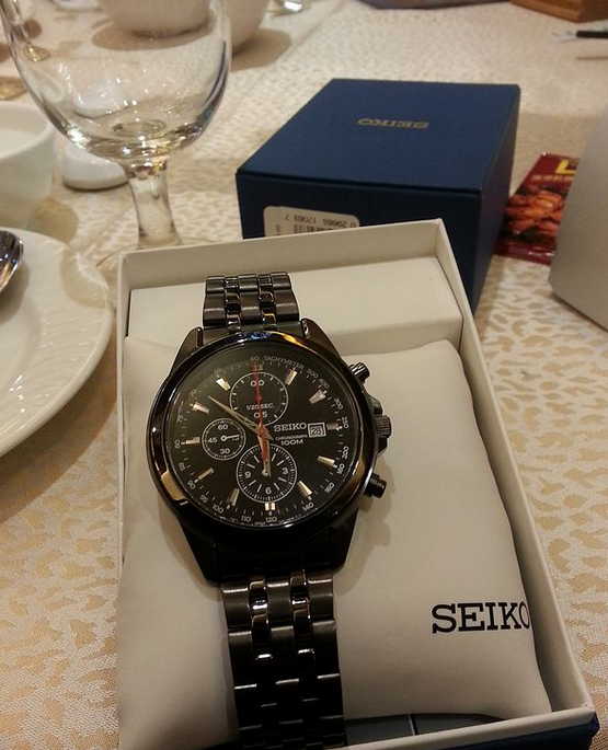 Seiko Men's SNDF11男式计时腕表,三眼计时设计,包括12小时、60分钟以及1/20秒计时功能,表圈上还带有视距仪刻度。黑色表链搭配黑色表盘,中间红色表针点缀,日本机芯,离子镀不锈钢表壳与表链,100米防水,Hardlex矿物水晶镜面,3点钟方向日期显示。美国亚马逊(下单教程)闪电特价$99.99,到手约¥690(不含税)