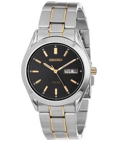 这款型号SNE047的精工男士太阳能手表,黑色表盘搭配金色指针,不锈钢间金表带,外观稳重大气,内部使用VI58太动能机芯,黑色表盘搭配金色夜光指针和刻度,双色不锈钢表壳和表带,简单大方,3点钟星期日历显示,表盘直径37mm,厚度10mm,耐磨Hardlex表镜,防水30米。美国亚马逊(下单教程)特价$67.48 到手¥475