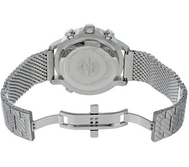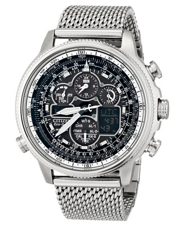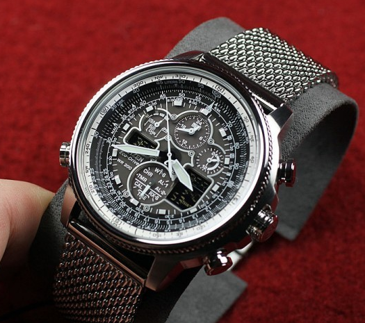 此款型号JY8030-83E,是空中之鹰系列2013年新款,新款U680光动能电波机芯,可收国内秋波,每天凌晨2点及4点自动接收电波校时,10万年仅一秒误差的超高精确度。其他功能包括世界时间(43个城市)、万年历、指针数字双显、日历、星期、12/24小时显示、数字照明、2组闹铃、1/100秒秒表(计时范围24小时)、旋转计算尺边框、航空标尺、倒计时、剩余电量显示等,表盘直径46mm,少见的不锈钢链式表带,耐磨抗反射矿物玻璃表镜,防水深度200米。