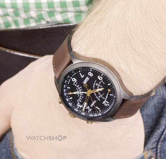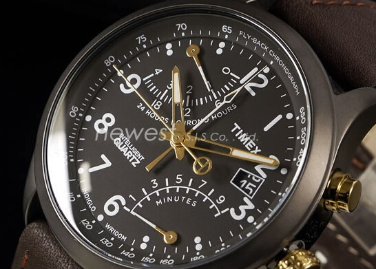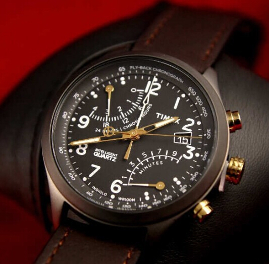 属于TIMEX标志性的IQ系列,离子镀灰表壳搭配金色指针,10点钟24小时计时,5点钟10分钟计时,3点钟日历显示,可测量65~650公里时速,计时指针采用超酷飞返/逆跳式设计,当然TIMEX招牌式的INDIGLO®夜光表盘是不可或缺的,真皮表带,防划矿物表镜,防水深度100米。目前售价$94.02,使用优惠码20TIME14,折后实付$75.22,到手¥525,国内天猫¥1158(海淘教程)