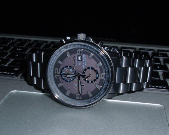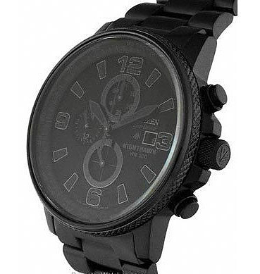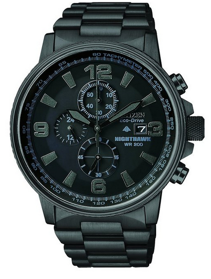 Citizen Men's CA0295-58E Eco-Drive Nighthawk Watch这款西铁城光动能手表采用了黑色离子镀不锈钢表壳和专有的生态驱动技术,内置光动能面板,在白天吸收的光能维持手表的驱动。整体通黑,夜光指针,有Nighthawk标记,三眼设计,12/24小时显示、60分钟计时、1/5秒秒表、数字照明,功能一应俱全,200米防水,和耐磨的矿物水晶表镜。