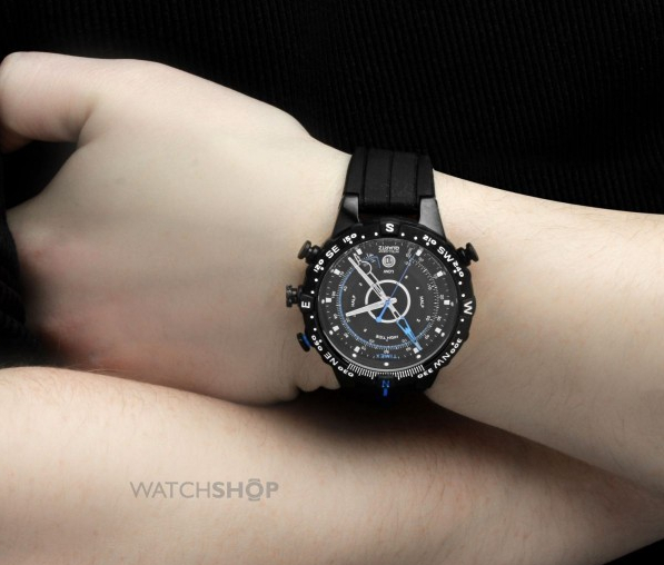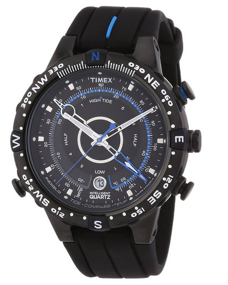 Timex Men's T49859 Intelligent Quartz Adventure Series Tide Temp Compass Black Silicone Strap Watch天美时多功能计时男表,延续了天美时IQ系列出彩的外观设计,采用天美时特有的六指针机芯,表径45mm,厚度13.2mm适合大多数人佩戴,功能包括指南针、潮汐时间、温度测量计时、日期显示,4指针包括小时、分钟、秒钟、以及计时码表,当然TIMEX招牌式的INDIGLO®夜光表盘是不可或缺的,不锈钢表壳,树脂表带,防划矿物表镜,防水深度100米。