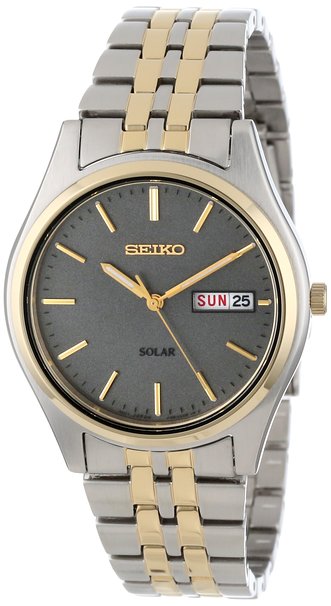 这款Seiko 精工 SNE042男表,采用太阳能供电石英机芯,无需更换电池,哑光深灰色表盘搭配金色夜光指针,3点钟方向为日历和星期双历显示,不锈钢间金表壳和表带,表壳直径只有37mm,厚10mm,适合喜欢小表盘的,强化矿物表镜,防水30米。目前降至新低$93.45,到手约664元,美亚评价多达236条,看来这个款式很适合大众口味。(海淘教程)