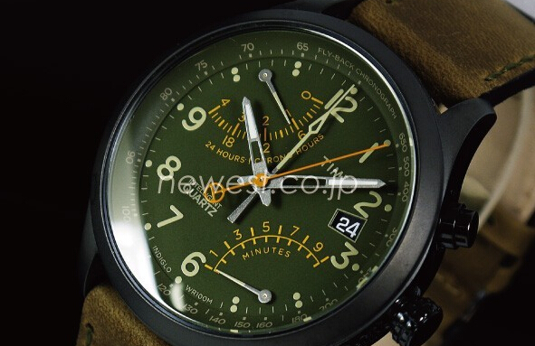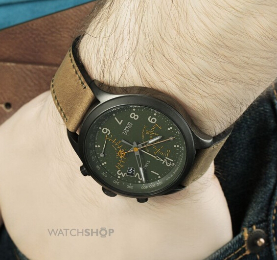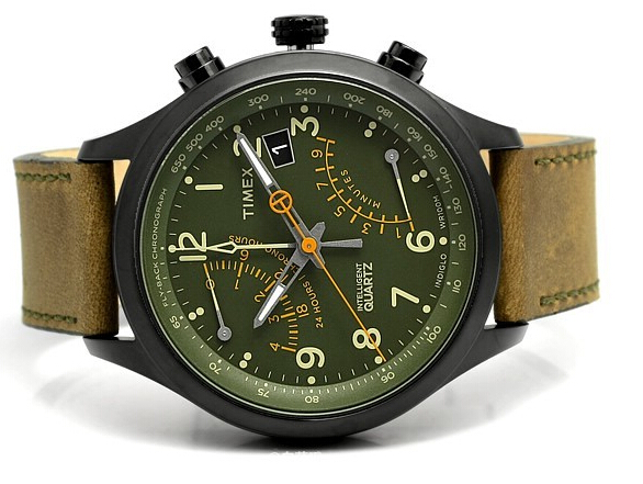 采用天美时特有的六指针机芯,表径43mm,厚度12mm适合大多数人佩戴,10点钟24小时计时,5点钟10分钟计时,3点钟日历显示,计时指针采用超酷飞返/逆跳式设计,4指针包括小时、分钟、秒钟、以及计时码表,表盘外沿为测速仪刻度,可测量65~650公里时速,当然TIMEX招牌式的INDIGLO®夜光表盘是不可或缺的,棕色真皮表带,高耐磨矿物水晶表镜,防水深度100米。