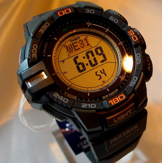 卡西欧 登山系列 PRG-270-1 太阳能登山手表,使用太阳能供电无需电池,充满电后最长可待机长达6个月。包括卡西欧第三代三重感应器(数字高度计、气压计、温度计和指南针),新增风暴警告功能,天气突变时,配戴者能第一时间知晓。目前Amazon售价$94.49,发货重量1磅,预计到手约¥645,如果被收取关税按20%计算为¥130(海淘教程)