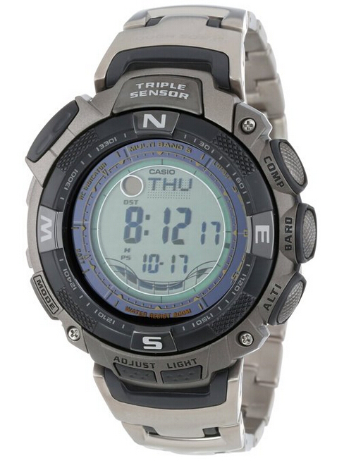 国内其他大部分地区都可以接收到日本电波信号进行自动对时,达到“分秒不差”的精确走时。在使用太阳能为动力无需更换电池,完全充电后,节能模式下使用时间高达5个月,另外功能十分强大,包括卡西欧登山系列当家的三重感应器:数字罗盘(方向感应器)、温度计(温度感应器)、高度计(压力感应器)。可对环境参数进行精确测量。另外还具备5组独立闹铃,整点报时,倾斜自动背光,日出日落时间,200米防水等功能。表盘直径51mm,厚度14mm,另外使用的钛金属表带抗磨性能和防锈性能极佳,并且十分轻便对皮肤没有刺激。