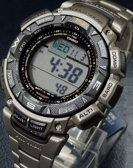 PAG240T-7CR使用太阳能供电无需电池,充满电后最长可待机长达6个月。包括卡西欧的当家技术三重感应器(数字高度计、气压计、温度计和指南针),并具有海拔绘图功能和日出日落时间显示。全自动EL背光,世界时间(48个城市),5组闹铃,1/100秒表功能等。表盘直径51mm,厚度15mm,防刮矿物晶体表镜,防水深度100米,表壳和表带均采用钛合金,非常轻而且不刺激皮肤,具有舒适的佩戴感。