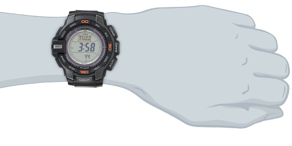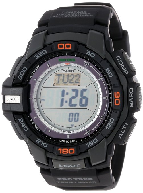 卡西欧ProTrek系列是专为户外爱好者打造,众多实用功能让ProTrek系列更加完善和方便。此款型号为PRG-270-1男款腕表,表款采用了全新升级的缩减95%,省电90%的第三代三重感应器(温度,气压,高度), 进一步减少了能量消耗且提高了测量精度。太阳能驱动,同时新增风暴警告功能,天气突变时,配戴者可第一时间知晓。可抵抗低温-10°C 。其他方面:世界时间(48城市)、日出日落时间显示*秒表(1/10秒)、倒计时、闹铃、电量指示符、全自动日历、12/24小时时制。 虽没有电波对时功能,但其他众多实用功能和亲民的价格让其颇受欢迎。 目前美国亚马逊上报价 $101.99,到手约710元。(下单教程)