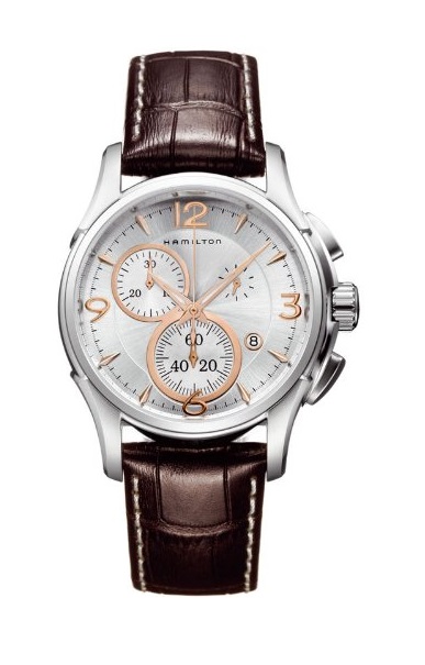 Hamilton汉密尔顿 H32612555 Jazzmaster爵士瑞士制造玫金三眼计时男表,采用瑞士原厂石英机芯,精钢表壳,银色表盘,尺寸42mm,棕色牛皮表带,耐磨蓝宝石水晶玻璃镜面,针扣式表扣,防水深度100米,带有日期显示、计时码表功能!