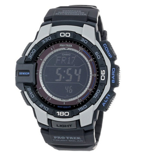 Casio 卡西欧 PRG-270-7CR 男款反显三重感应器登山表。采用了全新升级的缩减95%,省电90%的第三代三重感应器(温度,气压,高度), 进一步减少了能量消耗且提高了测量精度。太阳能驱动,同时新增风暴警告功能,天气突变时,配戴者可第一时间知晓。可抵抗低温-10°C 。其他方面:世界时间(48城市)、日出日落时间显示*秒表(1/10秒)、倒计时、闹铃、电量指示符、全自动日历、12/24小时时制。另有100M防水功效。众多实用功能和亲民的价格是其颇受欢迎的重要因素。美国亚马逊(下单教程)原价$180优惠价$108.45到手约760元。