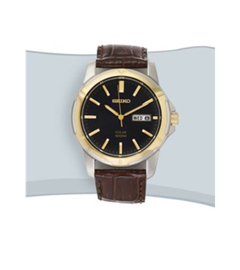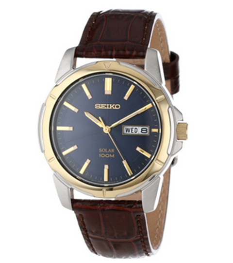 这款精工男士经典光动能手表内置精确日本石英机芯,利用自然光供能,无需电池,节能环保,外观采用褐色真皮表带搭配金银配色不锈钢表壳设计,尊贵典雅,气质非凡,防刮耐磨矿物玻璃表镜下为蓝表盘,表盘上镶有金色全时刻度,边缘精确到秒,3点钟方向为日历显示窗,夜光指针方便夜间读取,表盘直径37mm,防水深度100m。