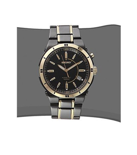 SEIKO 精工 SKA366 钛碳表面手表,高贵的金/黑配色,不锈钢材质表壳表带,表面做了钛碳处理,坚固耐磨。配上金色表圈和金色指针和刻度,高贵大方。表盘上5点钟位置带有日期显示,表盘厚度11毫米,表盘直径为39毫米,内置石英机芯,防水100米。