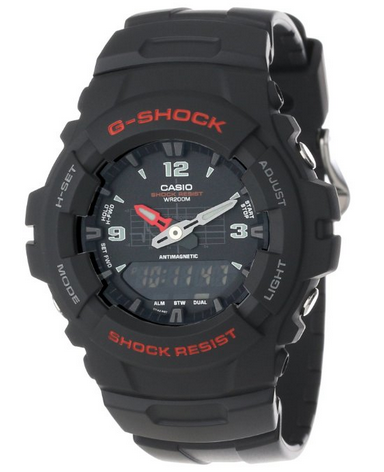 Casio 卡西欧 G-Shock G100-1BV 指针数字双显手表,用的47毫米黑色表盘,双显设计,既有指针显示,也有数字电子显示,搭配舒适的黑色树脂运动表带,具有不错的抗震性,采用日本原装石英机芯,矿物水晶的表盘,夜光指针,计时秒表功能,防水200米。