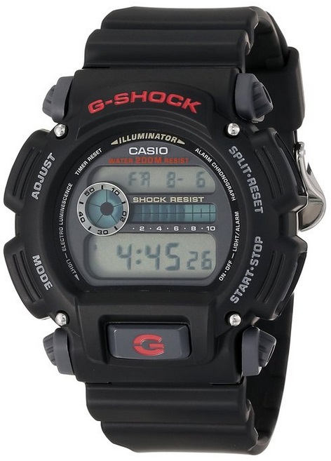 Casio 卡西欧 G-Shock DW9052-1V 防水多功能带背光电子表,属于入门级的表款,本表表盘为46mm,表圈和表带采用树脂材料,适合粗胳膊的男士,另外G-SHOCK系列在抗恶劣环境下工作十分适合,包括200防水的特性。按下G键后表面有夜光光源,晚上也能看清。没有采用那些诸如强劲太阳能等新技术。