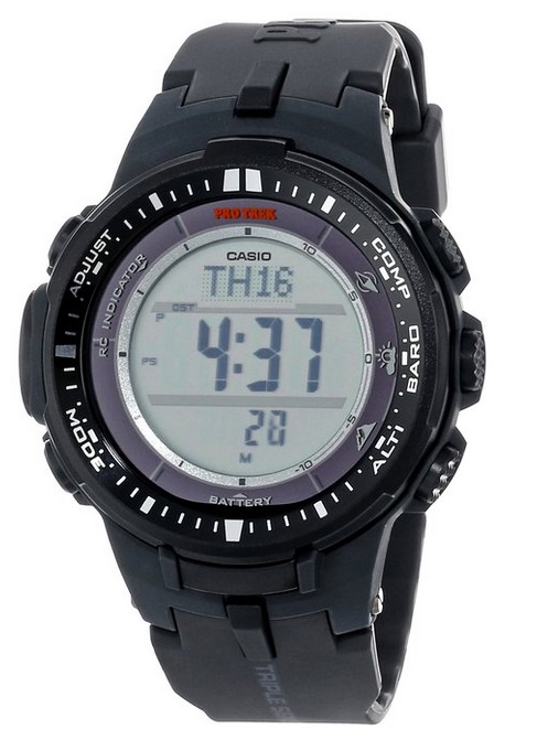 Casio 卡西欧 PRW-3000-1CR 太阳能6局电波登山表,搭载了CASIO第三版全新三重功能传感器(数字罗盘、温度感应器、高度计),比以往的老款感应器的体积减小95%,能耗减少了90%,从而让手表变得更轻薄,表盘直径由PAW2000的50mm缩小到46mm。太阳能充电即使在微弱的日光灯下也能发挥充电功能。全球6局电波依然保留,包括国内商丘站信号,达到“分秒不差”的精确走时。日出日落时间显示也是非常实用的功能,防刮矿物晶体表镜,树脂表壳和表带,防水100m。