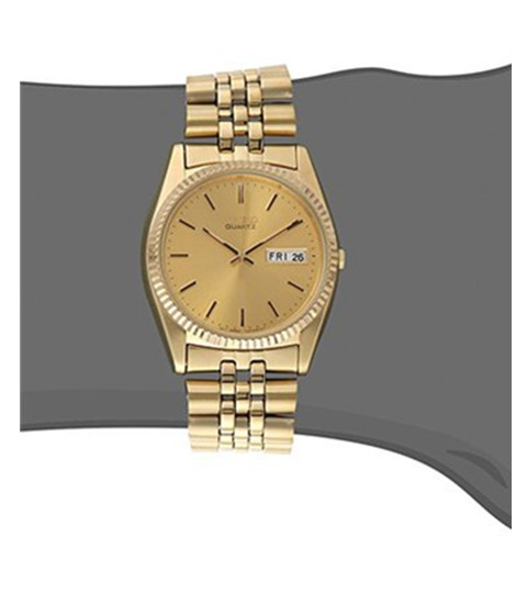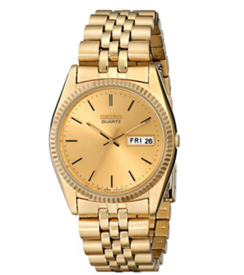 Seiko精工SGF206男士不锈钢正装金色手表,日本石英机芯,不锈钢镀金手表,Hardlex 水晶表盘,星期和日期窗口,夜光指针,折叠式表扣,防水深度达30米。