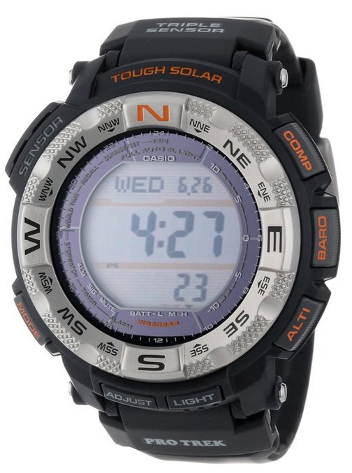 CASIO 卡西欧 PRG260-1 太阳能登山表,采用第三代三重感应器,罗盘及温度、气压、高度测量,进一步减少了能量消耗的同时提高了测量精确度。设计应用了人体工程学,太阳能动力。耐低温-10℃,全自动EL背光照明,其他方面:世界时间(48城市)、5组闹铃、秒表(1/100秒)。防刮矿物晶体表镜,树脂外壳和表带,表径44mm,厚度14mm,防水100m。
