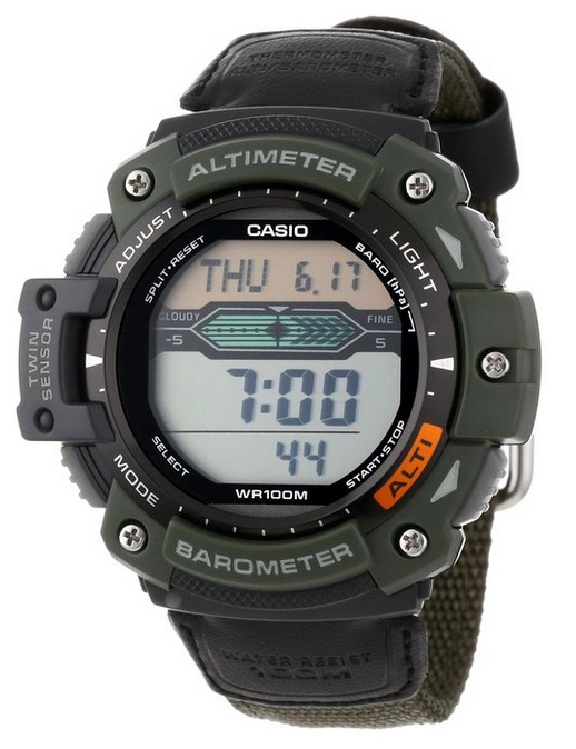 CASIO 卡西欧 SGW300HB-3AVCF 太阳能登山表,入门实惠型多功能户外腕表,但功能却较为全面,耐低温(-10度);高度测量(-700至10000米); 温度测量(10°C / + 60°C),气压感测器(测量范围:260/1100hPa),每两个小时会自动测量气压,它同时还具有闹铃、日历星期秒表计时,倒数定时,整点报时、世界时间、及100米防水等功能。表径42MM,帆布表带。