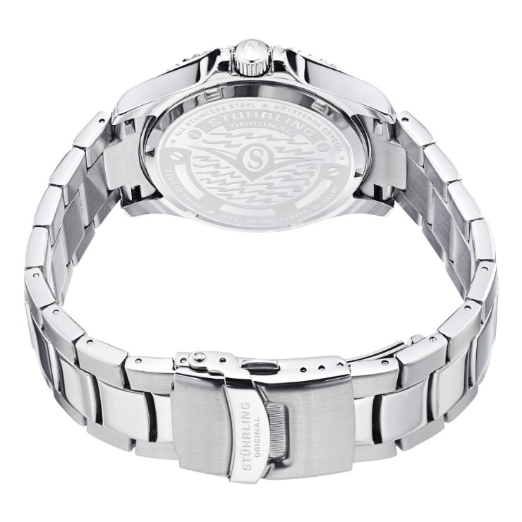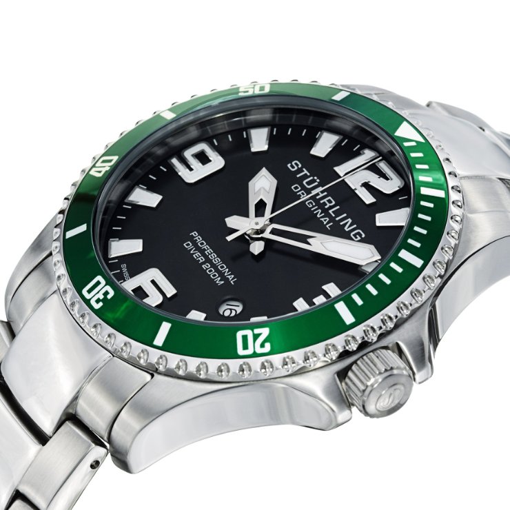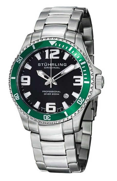 Stuhrling Original斯图灵 395.33P154 "Aquadiver Regatta Champion" Stainless Steel Watch with Green Bezel 男士自动机械手表,这款圆形不锈钢手表有黑色的表盘,绿色边框,不锈钢金属制成的表带,在12点下有斯图灵字母标志,采用瑞士石英机芯,水晶镜面,带有日历功能,200米防水!