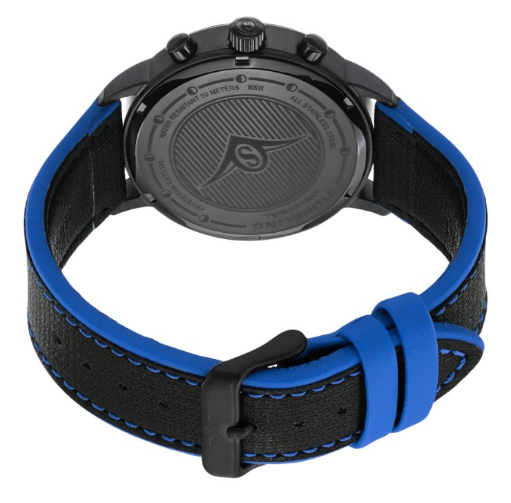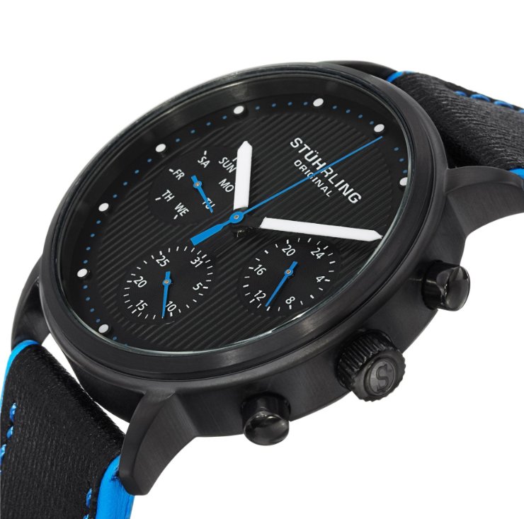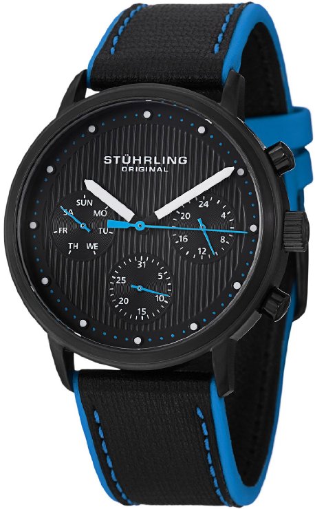 Stuhrling Original斯图灵 514.03 Concorso Obscure Quartz Multifunction Blue Accent Watch 男士手表,表盘材质采用Krysterna水晶,表壳直径42毫米,表壳厚度11毫米,主题黑色酷劲十足,搭配蓝色秒针和三眼小针以及白色分针秒针,有一种不同一般的味道在里面!