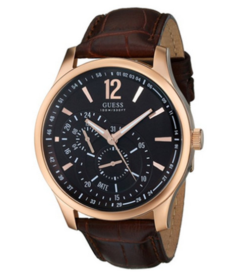 此款 GUESS U10627G1 男士经典手表内置优质石英机芯,保证了时间的精确,外观采用深褐色真皮表带搭配玫瑰金不锈钢表壳,尊贵优雅,气质非凡,防刮耐磨矿物玻璃表镜下为黑色哑光表盘,表盘上镶有玫瑰金刻度,边缘精确到秒,带有日期副表盘,夜光指针方便夜间读取,表盘直径44mm,防水深度50m。美国亚马逊(下单教程)目前售价$78.75到手约574元。