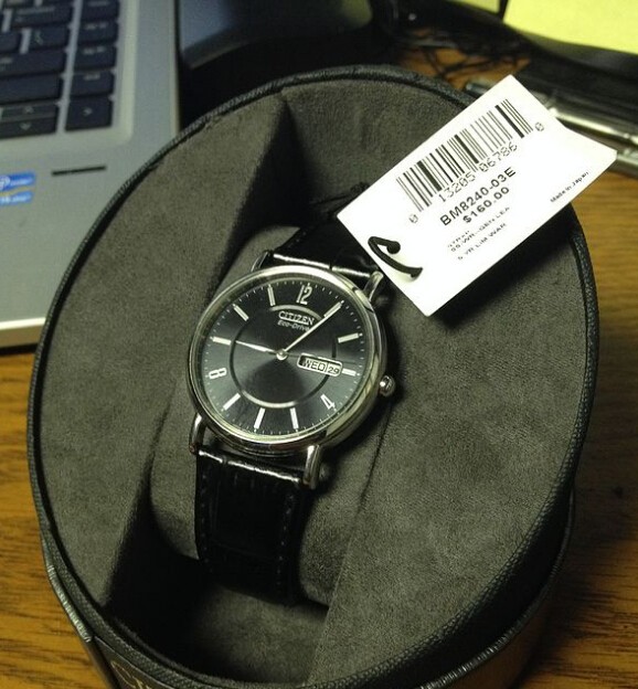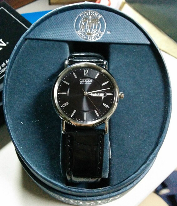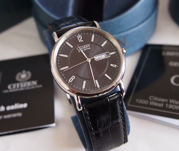 这款编号BM8240-03E的光动能男表,中规中矩的黑色表盘搭配银色指针,3点钟日历和星期双显,外观看起来并不廉价。机芯是CITIZEN标志性的Eco-Drive光动能石英机芯,终身无需更换电池。表盘直径36mm,厚度8mm,比较适合手腕纤细的白净书生和文艺青年,真皮表带,防水30米。