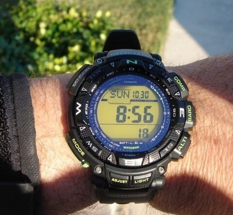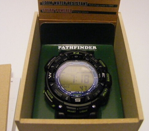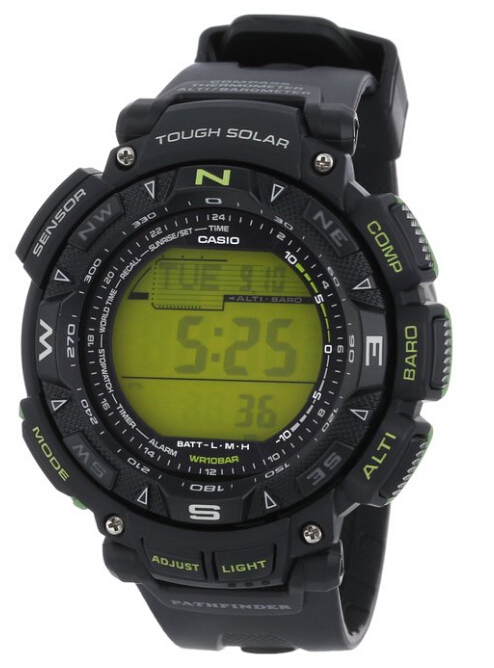 Casio 卡西欧 PAG240-1BCR 探路者系列 三重感应器 太阳能多功能运动手表,属于卡西欧探路者系列,太阳能供电终身无需更换电池,充满电最长可待机长达6个月。包括卡西欧的当家技术baicaio.com三重感应器(数字高度计、气压计、温度计和指南针),并具有海拔绘图功能。全自动EL背光,世界时间(48个城市),5组闹铃,日出日落时间,1/100秒表功能等。表盘直径51mm,厚度15mm,防刮矿物晶体表镜,树脂外壳和表带,防水深度100米。