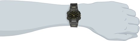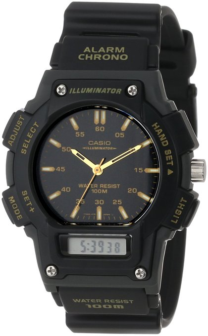 这款Casio Men's AQ150W-1EV Ana-Digi 卡西欧运动双显防水男表,树脂外壳及表带,石英机芯,指针与液晶双显表盘,表盘直径40mm,金色指针,耐磨矿物水晶表镜,百米防水。此外,还具有计时、日期、月份、表盘背光功能。
