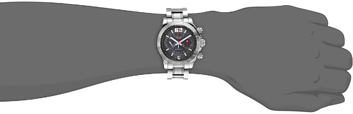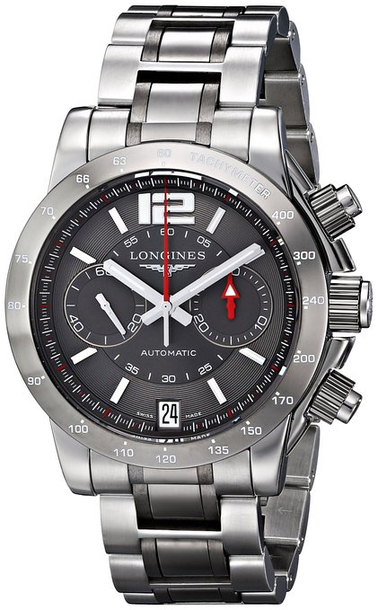 这款Longines 浪琴 L36674067 Admiral瑞士自动机械男士腕表,12点钟位置阿拉伯数字标时,两个时尚计时码表子表盘,测速功能;夜光银色和红色指针和标时,旋入式表冠;6点钟日历显示,表盘直径42mm,厚度15mm,抛光精钢表壳和灰银两色精钢表带,防水深度为100米。奢侈手表设计风格!