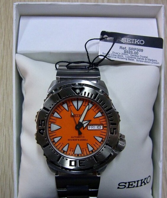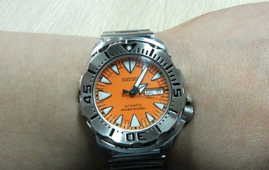 SEIKO精工SRP309是SKX781的升级版,人称“新橙鬼”,橙色表盘光彩夺目。机芯采用4R36自动机械机芯,单向旋转表圈可准确计量潜水时间,当然作为潜水表夜光指针自必不可少,使得其可以在光线较暗的情况下辨别时间,Hardlex防刮水晶表镜,不锈钢表带,简洁大气,表壳宽42mm,200米防水