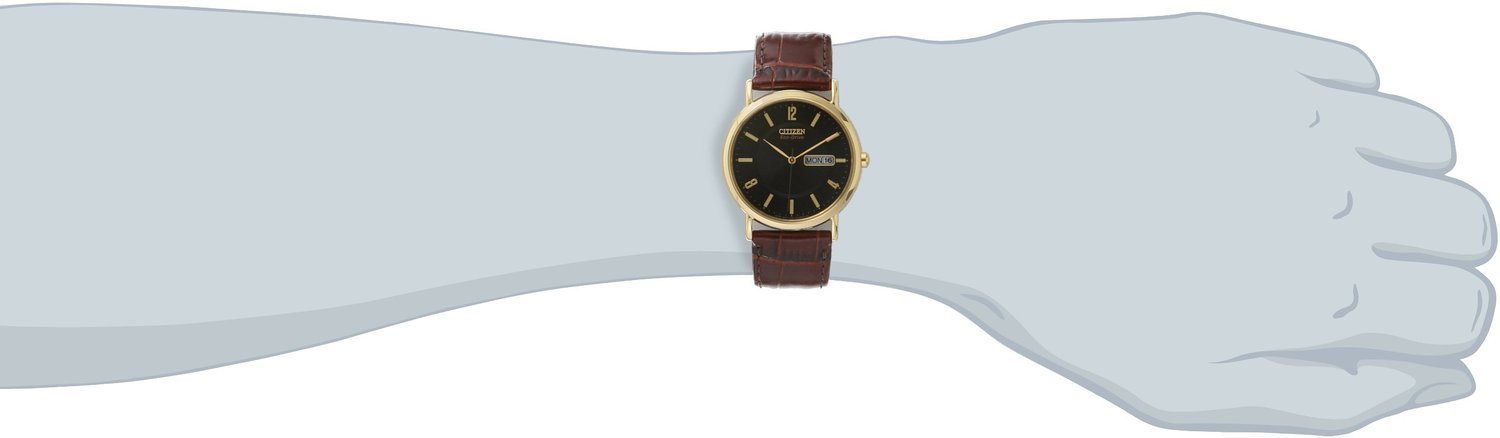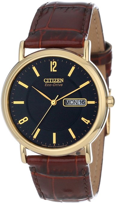 这款Citizen BM8242-08E西铁城男士经典光动能石英手表,内置精确日本石英机芯,采用Eco-Drive技术利用自然光供能,无需电池,节能环保,外观采用褐色皮带搭配金色不锈钢表壳,经典高贵,气质非凡,防刮耐磨矿物玻璃表镜下为黑色表盘,表盘上镶有金色全时刻度,边缘精确到秒,3点钟方向为日历显示窗口,金色时分秒指针,表盘直径35mm,简单防水。