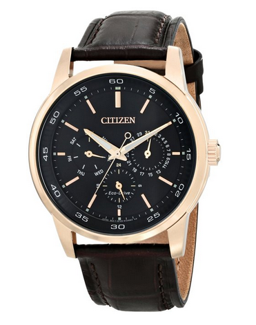 这款西铁城男士手表内置精确日本石英机芯,采用Eco-Drive技术利用自然光供能,无需电池,节能环保,外观采用褐色真皮表带搭配玫瑰金不锈钢表壳,经典优雅,气质非凡,防刮耐磨矿物玻璃表镜下为黑色表盘,表盘上镶有金色全时刻度,边缘精确到秒,日历星期副表盘方便读取,夜光指针,表盘直径44mm,防水深度100m。