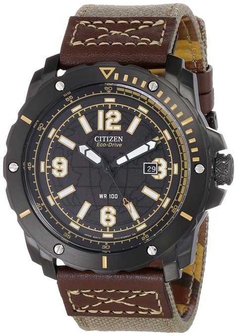 这款Citizen BM7279-03E 西铁城男士经典光动能石英手表,内置精确日本石英机芯,采用Eco-Drive技术利用自然光供能,无需电池,节能环保,外观采用褐色皮带搭配黑色不锈钢表壳,经典高贵,气质非凡,防刮耐磨矿物玻璃表镜下为黑色表盘,表盘上镶有金色全时刻度,边缘精确到秒,3点钟方向为日历显示窗口,金色时分秒指针,表盘直径35mm,简单防水。灰色帆布表带,宽18mm,适合运动和户外达人。 100米防水保证您在日常生活过程中轻松随意佩戴。