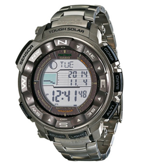 PRO TREK PRW-2500T系列具备3大感应器,可敏锐侦测温度、高度/气压及方位,另包含200米防水功能,为上山下海、各类户外活动的最佳配备。採用大型液晶萤幕表面,提升辨识度,除了数字显示,同时可显示月相、潮汐图等多功能图形。坚韧的耐低温设计,可抵挡摄氏-10C的恶劣气候。表钮防护装置更能防止碰撞的意外按压。具备太阳能电力表盘,吸收日光或微弱光源转化成电力储存于电池中,驱动所有功能都能精确运作,搭载世界6局电波接收,提供精准的时间资讯。钛合金表带,强悍耐用,重量更轻薄。
