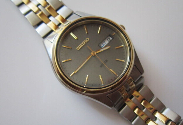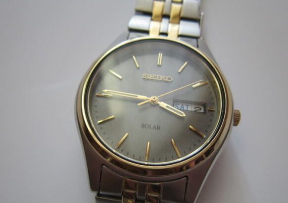 这款Seiko 精工 SNE042男表,采用太阳能供电石英机芯,无需更换电池,哑光深灰色表盘搭配金色夜光指针,3点钟方向为日历和星期双历显示,不锈钢间金表壳和表带,表壳直径只有37mm,厚10mm,适合喜欢小表盘的基友,强化矿物表镜,防水30米。