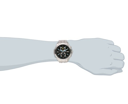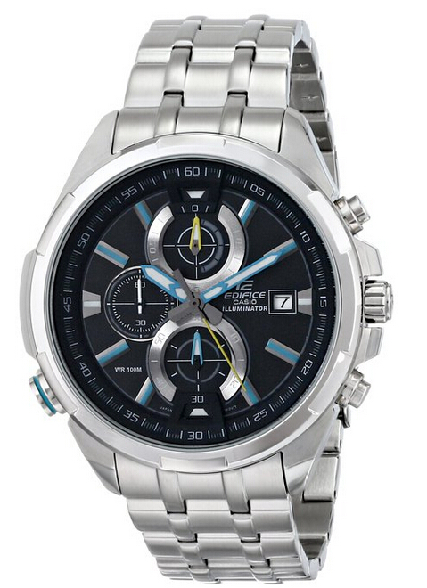 此款卡西欧手表属于EDIFICE系列,极富男士魅力的商务休闲风格。采用不锈钢表壳和表带。黑色表盘搭配蓝色指针和刻度。三眼式设计。三点钟位置显示日历。带有LED背光,指针和刻度带有荧光,在暗处使用时非常方便。表盘直径50mm,属于比较大的手表。厚14mm。防水100米。
