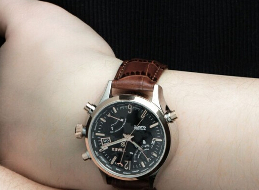 Timex 天美时 IQ系列 T2N701 多功能计时男表,延续了天美时IQ系列出彩的外观设计。手表支持飞返/逆跳技术,一般的表针均作圆周运动,旋转一圈时刚好返回原位,所以终点总是下一轮的起点。采用天美时特有的六指针机芯,表径42mm,厚度13mm适合大多数人佩戴。5点钟及10点钟方向小表盘计时分钟及小时,3点钟日历显示。大表盘4指针分别是小时、分钟、秒钟、以及计时码表,表盘外沿为测速仪刻度,可测量65~650公里时速。抛光表圈,黑色表盘,银白时标及指针,真皮表带,防划矿物表镜,防水深度100米。当然还少不了美时独有的Indiglo夜光功能,夜间超酷。