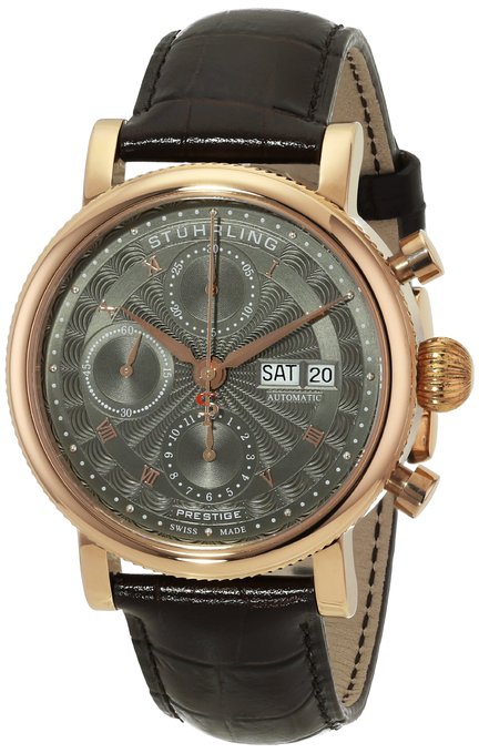 这款 Stuhrling Original 139.04 Prestige 斯图灵男士机械手表,内置优质瑞士机械机芯,保证了时间的精确,外观采用黑色真皮表带搭配16K玫瑰金不锈钢表壳设计,经典优雅,气质非凡,防划痕抗反射蓝宝石玻璃表镜下为灰色波纹表盘,表盘上镶有玫瑰金罗马数字刻度,3点钟方向为日历显示窗口,玫瑰金时分秒指针,表盘直径40mm,防水深度50m。
