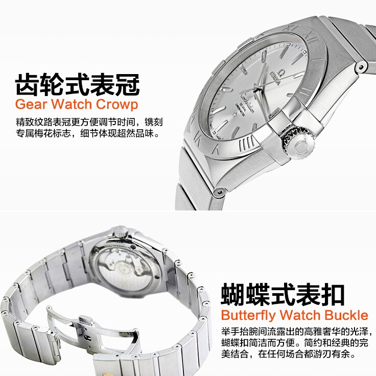 欧米伽奢侈男式自动机械表,历史新低价可入!这款欧米伽Constellation09星座瑞士自动机械男表,型号123.10.35.20.02.001,表壳直径约35mm,表壳和表带均适用精钢材质制成,耐磨防刮花;简洁素雅的银色表盘,精致纹路表冠方便调节时间,镌刻专属梅花标准,细节体现品味;透明表底,采用瑞士优质自动机芯,极致精准;透过蓝宝石水晶玻璃透明后盖,可感触自动锤的摆动及机芯内部的震动,防水深度100米。