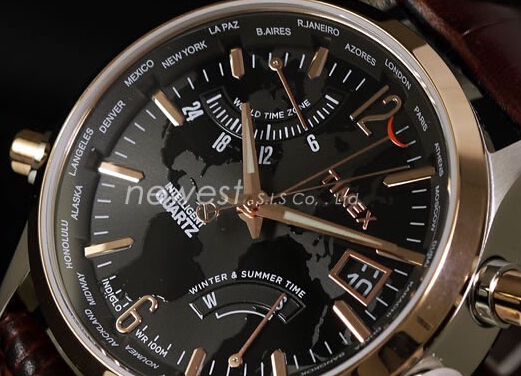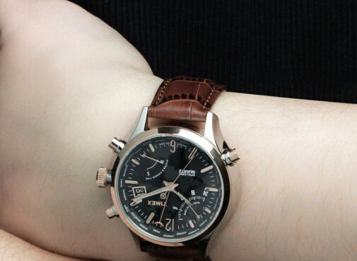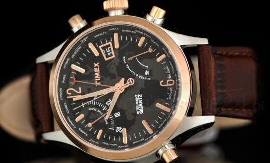 Timex T2N942DH 飞返式多功能计时男表,IQ系列,采用天美时特有的六指针机芯,表径44mm,厚度12mm适合大多数人佩戴,10点钟时区显示,5点钟季节指示,3点钟日历显示,计时指针采用超酷飞返/逆跳式设计,4指针包括小时、分钟、秒钟、以及计时码表。表盘外沿为全球24个地区的时间显示,当然TIMEX招牌式的INDIGLO®夜光表盘是不可或缺的,玫瑰金表壳和指针,黑色表盘,黑色鳄鱼纹处理真皮表带,高耐磨矿物水晶表镜,防水深度100米。
