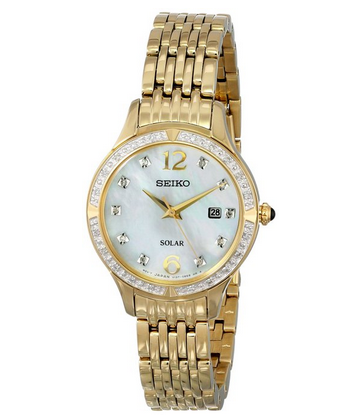 这款Seiko 精工 SUT094 珍珠贝母 镶钻时尚女士石英手表,采用日产V137太阳能机芯,吸收日常可见光作为能量来源,30颗白钻点缀时标及镶嵌表盘外圈,不锈钢镀黄金表壳表链,白色珍珠母表盘配金色指针,3点位置日期显示,黑色宝石表冠,表盘直径28mm,厚度为8mm,耐磨Hardlex表镜,30米生活防水。现美亚特价137美元,转运到手约925元(海淘教程)