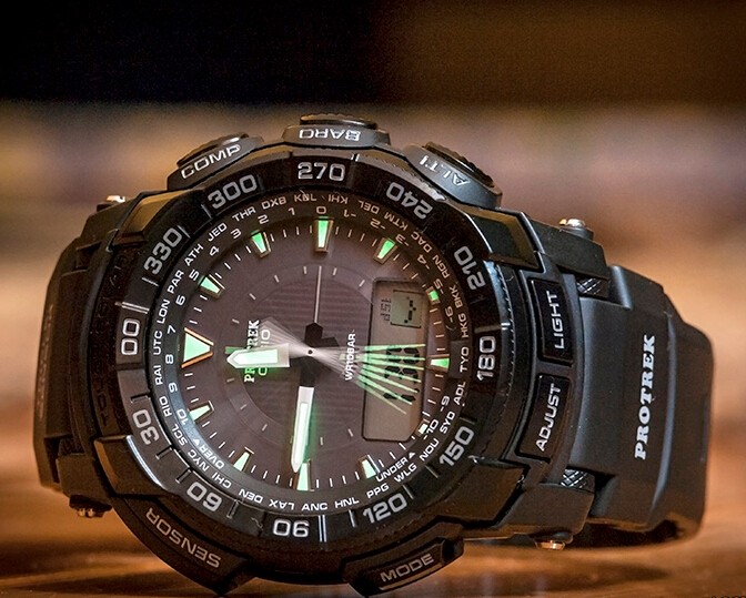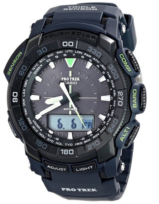 Casio PRG-550-2CR Protrek系列太阳能电波表专为冒险家或者登山运动员等设计,拥有一个数字罗盘和高度计/气压计/温度计采用大表盘设计,提升辨识度,支持数模双显,具备太阳能电力表盘,吸收日光或微弱光源转化成电力储存于电池中,驱动所有功能都能精确运作,但是不支持电波对时,这也是与PRW系列最大的不同。