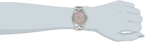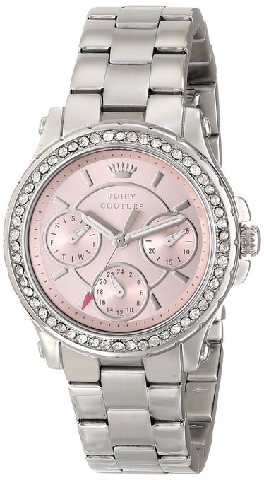这款 Juicy Couture Pedigree 橘滋女士时尚石英手表,内置精确日本石英机芯,外观采用银色抛光不锈钢表壳表链设计,表框周围镶有一圈水晶,晶莹剔透,奢华闪耀,防刮耐磨矿物玻璃表镜下为粉色表盘,表盘上镶有银色刻度,边缘精确到秒,三眼日历副表盘读取更加精确,夜光指针,表盘直径32mm,防水深度30m。