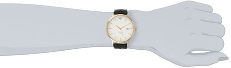 这款kate spade 1YRU0125 凯特丝蓓女士时尚石英手表,内置精确日本石英机芯,外观采用黑色皮革表带搭配银色不锈钢表壳,结合金色表框,时尚中不失奢华,防刮耐磨矿物玻璃表镜下为白色表盘,表盘上镶有金色全时刻度,3点钟为日历显示,12点钟为经典桃心logo,金色指针,表盘直径38mm,防水深度10m。