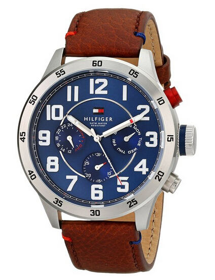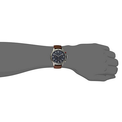 这款男式腕表,不锈钢表壳搭配棕色真皮表带。表圈上的分钟刻度更方便阅读,蓝色表盘上夜光银色指针和阿拉伯数字小时刻度,外缘分钟标记。三个子表盘显示星期,日期和24小时。石英机芯。防刮矿物晶体表镜,固体底盖。表壳直径46毫米,厚度14毫米。防水深度50米。美国亚马逊 (下单教程) 原价$155.00 ,现价$111.5 转运到手约 830元。