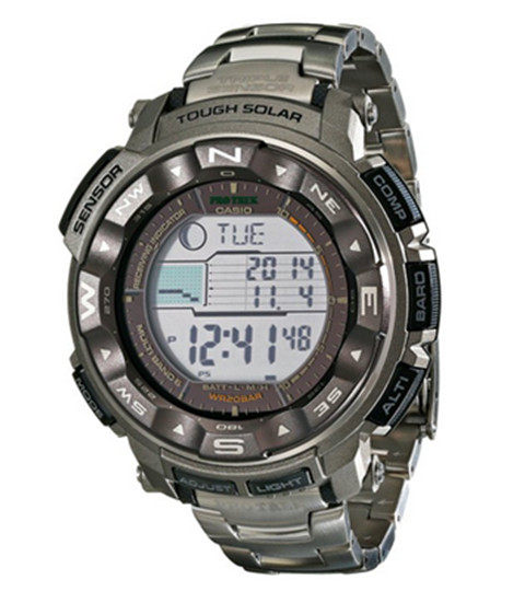 PRO TREK PRW-2500T系列具备3大感应器,可敏锐侦测温度、高度/气压及方位,另包含200米防水功能,为上山下海、各类户外活动的最佳配备。採用大型液晶萤幕表面,提升辨识度,除了数字显示,同时可显示月相、潮汐图等多功能图形。坚韧的耐低温设计,可抵挡摄氏-10C的恶劣气候。表钮防护装置更能防止碰撞的意外按压。具备太阳能电力表盘,吸收日光或微弱光源转化成电力储存于电池中,驱动所有功能都能精确运作,搭载世界6局电波接收,提供精准的时间资讯。钛合金表带,强悍耐用,重量更轻薄。