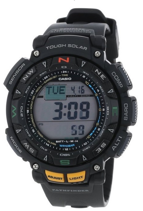 内置测压感应器,测量当前气压值!卡西欧Casio 男士探路者三重感应多功能手表 PAG240-1CR Pathfinder ,属于卡西欧旗下Pathfinder开拓者系列,主打卖点提供户外时候的全息数据。手表表盘直径50mm,表盘上彩色的巨大的字母分别 标志着东南西北4个方向,通过单键就能测量方向。手表采用太阳能驱动,并安装了一块充电电池,可通过太阳能不断为其充电,内置热敏电阻实现测温功能,内置测压感应器,测量当前气压值、通过内置硅片“阻力效应”感应当前高度,高度表每两分钟检查并显示海拔高度,并具有海拔绘图功能,当接近预设目标高度会进行提示,手表最高可以承受-10℃低温。