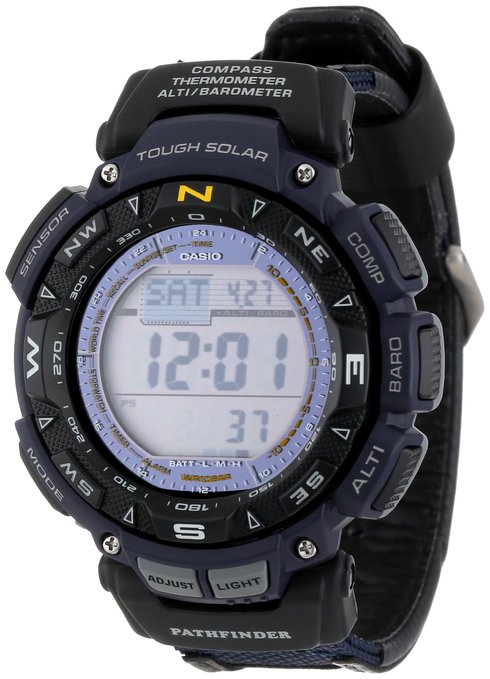 这款卡西欧Casio探险者多功能男士太阳能手表,手表表盘直径50mm,表盘上彩色的巨大的字母分别 标志着东南西北4个方向,通过单键就能测量方向,手表采用太阳能驱动,并安装了一块充电电池,可通过太阳能不断为其充电. 内置热敏电阻实现测温功能,内置测压感应器,测量当前气压值、通过内置硅片“阻力效应”感应当前高度,并具有海拔绘图功能。