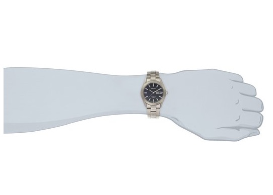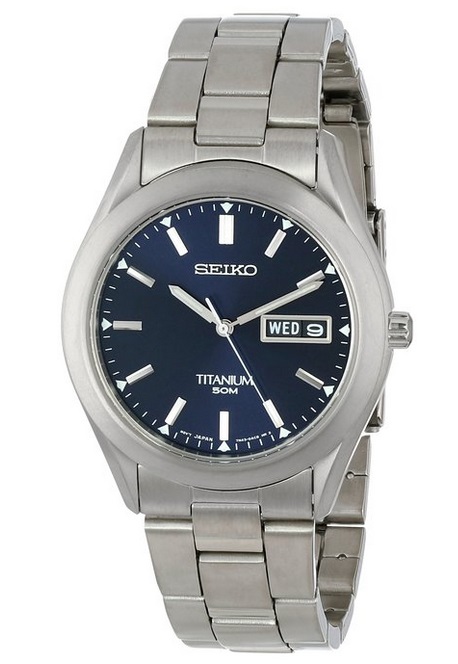 这款Seiko精工 Men's男士 SGG709 Titanium Watch钛手表,使用日本石英机芯,表壳和表带都是钛金属,蓝色表盘搭配具有LumiBrite发光漆的指针和刻度,表盘直径37mm,厚8mm,属于薄型手表,高强度防刮擦蓝水晶表镜,3点位置有日历、星期显示窗,防水达50米。